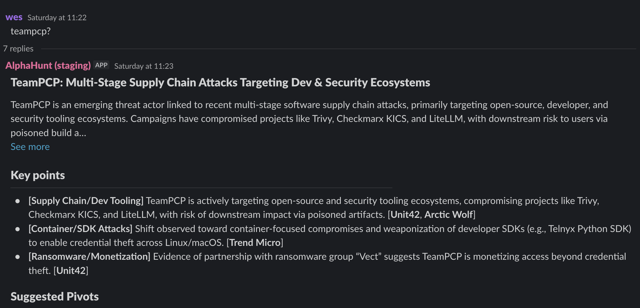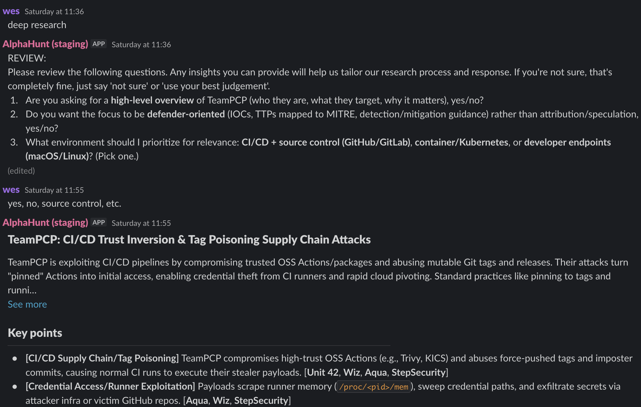 Get intelligence where it counts. No dashboards. No detours. AlphaHunt Converge teases out your intent, reviews the results and delivers actionable intel right inside Slack. We turn noise into signal and analysts into force multipliers.