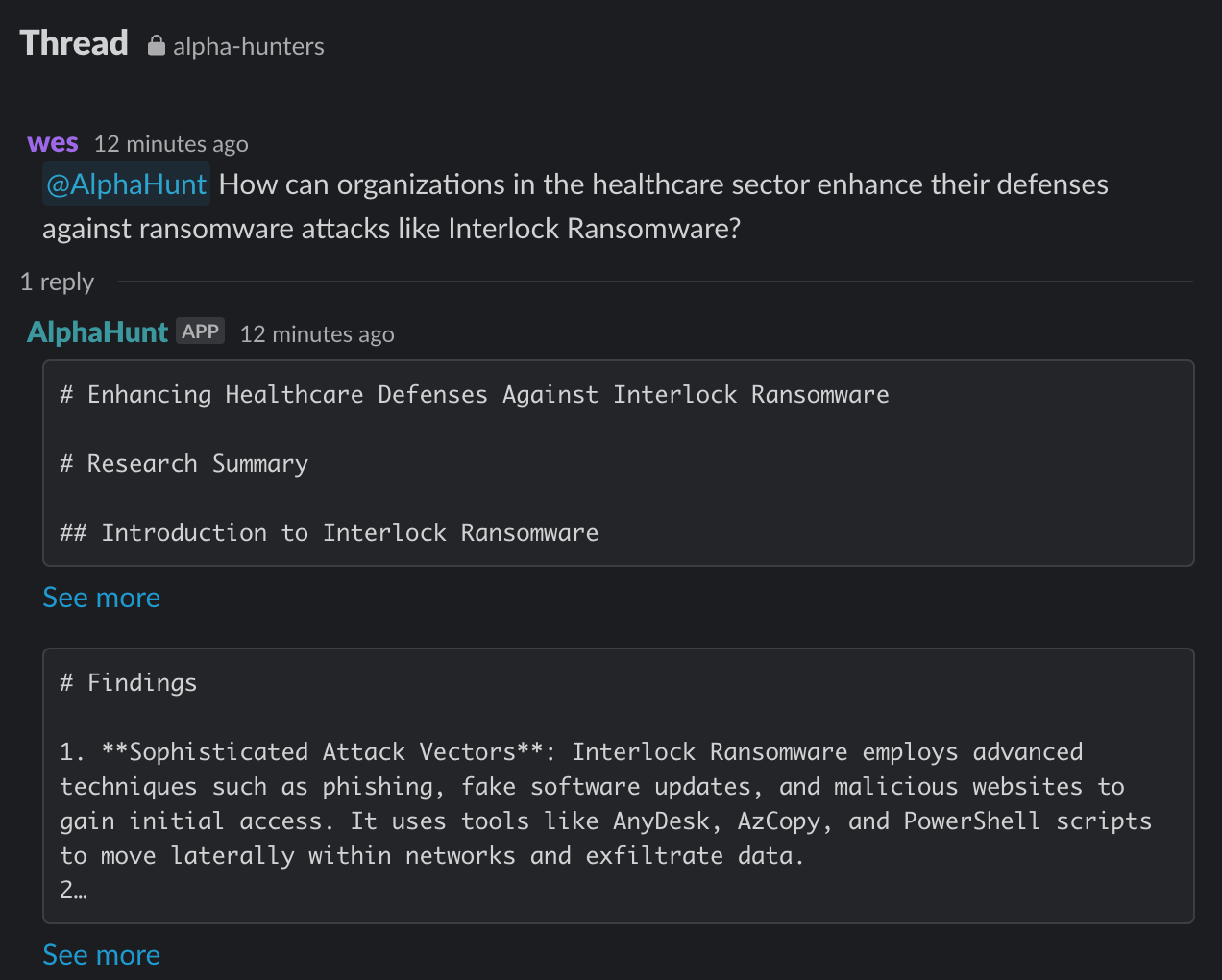 AlphaHunt works best- in Slack. Chat with your team, and your intelligence.