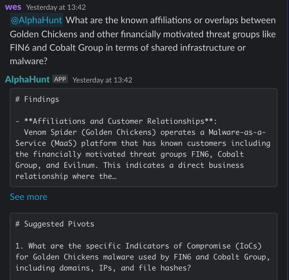 - FIN6: A Russia-based financially motivated cybercrime group known for targeting financial institutions and enterprises. FIN6 uses Golden Chickens' MaaS tools, including the More_eggs backdoor, in spearphishing campaigns targeting recruiters with fake job applications. Shared TTPs include use of malicious LNK files, social engineering, and modular malware.