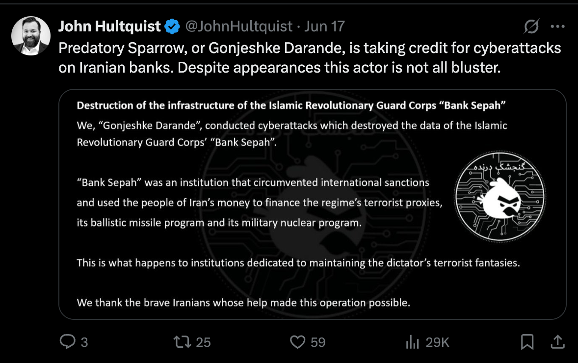 - Predatory Sparrow is a pro-Israel hacktivist group targeting Iranian critical infrastructure, especially banking and energy sectors.